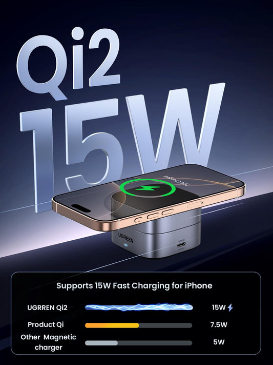 UGREEN 35316 MagFlow Qi2 Wireless Charger, 15W Foldable 2 in 1 Magsafe Charger for Travel, Adjustable Wireless Charging Station Compatible with iPhone 16/15/14/13/12 Series, AirPods 3/2/Pro (No AC Adapter)